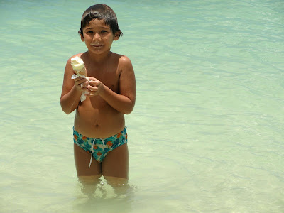 Bizden bir hafta önce aynı promosyonu görüp aynı seyahati yapan Erhan’dan aldığım haritaya baka baka Mahébourg’a en yakın plaj olan Blue Bay’e gittik. Neşe’nin İzmir’de başlayan soğuk algınlığı devam ettiğinden o kıyıda çantaların başında bekledi, biz de Can ile ilk dalışımızı yaptık.